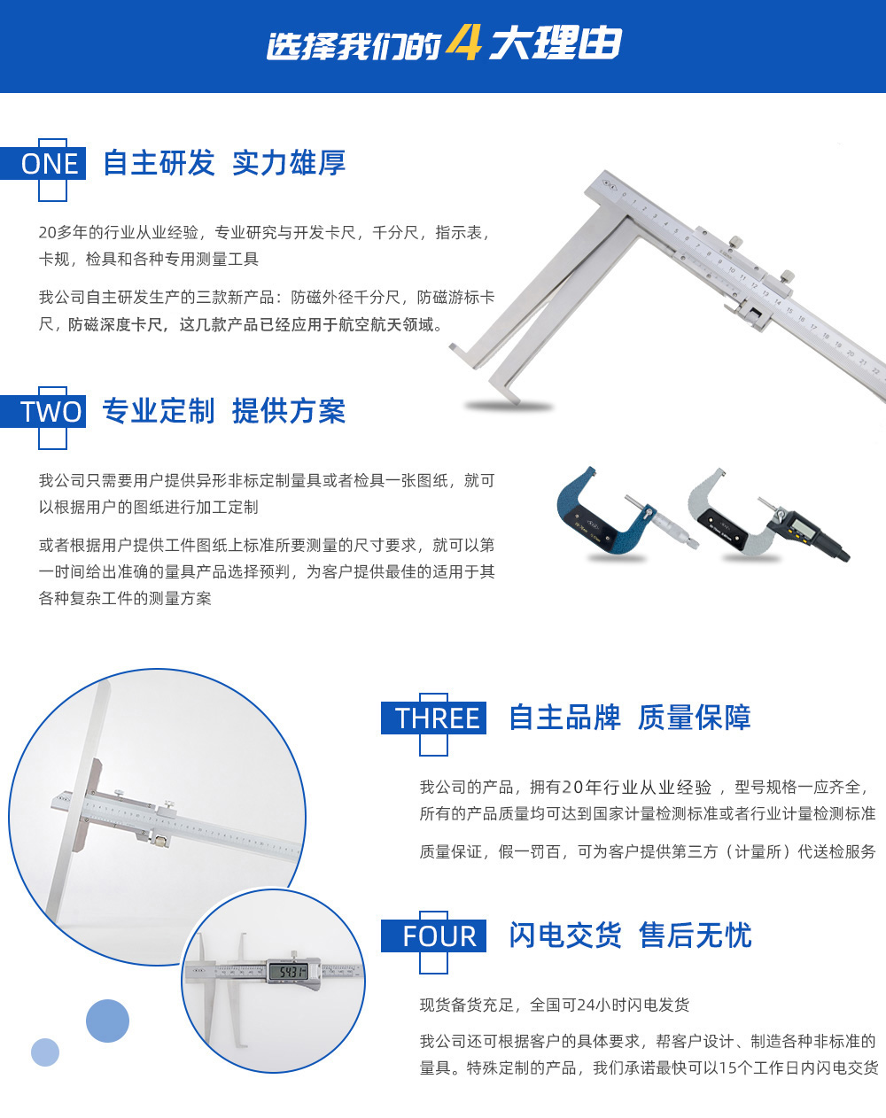 天津桂量量具刃具有限公司,擁有20年的行業(yè)從業(yè)經(jīng)驗,主要生產(chǎn)游標卡尺卡尺,數(shù)顯卡尺,帶表卡尺,各種千分尺,百分表,內(nèi)徑百分表,高度游標卡尺,深度卡尺,卡規(guī),檢具和各種測量工具,是一家集設計生產(chǎn),銷售為一體的企業(yè)。 我公司開發(fā)生產(chǎn)了三款新產(chǎn)品:防磁外徑千分尺,防磁游標卡尺,防磁深度卡尺,這幾…